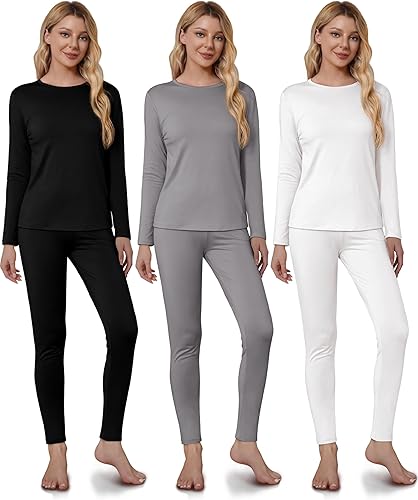 3 Set Thermal Underwear for Women, Base Layer Long Sleeve Thermals with Fleece Lined Thermals Top and Bottom Set