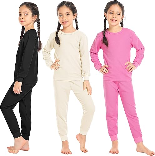 3 Sets Girls Waffle Thermal Underwear Set Winter Waffle Cotton Thermal Top and Bottom Long Johns Warm Base Layer